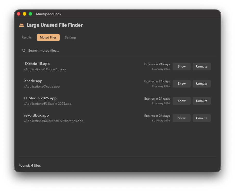 MacSpaceBack takes a different approach. Instead of giving you tools to navigate the entire file system, it focuses on two signals that matter most: file size and time since last use. By combining these, it highlights the biggest space consumers that are most likely safe to remove, without requiring deep navigation. The result is a clear, prioritized view of what’s taking space and why—so reclaiming storage is simple and deliberate.