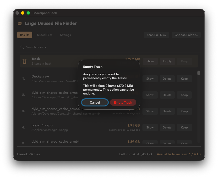 Worried about important files? MacSpaceBack uses native macOS removal functions: files are first moved to the Trash, and you’re asked for confirmation before it’s emptied. You can also click any suggestion to reveal the file in Finder, giving you more context or letting you delete it yourself using familiar macOS tools.