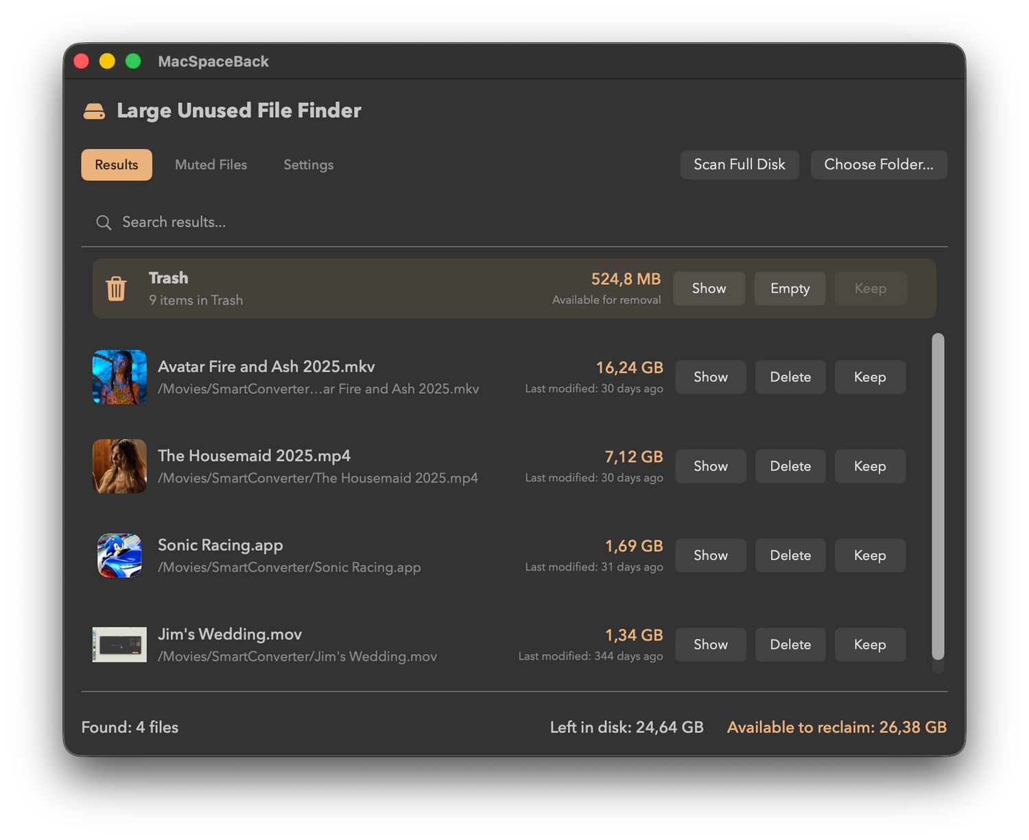 MacSpaceBack is a macOS application designed to help you efficiently reclaim disk space with minimal effort. The app identifies large, unused files and presents them in a clear descending list, allowing you to quickly review and delete them to free up space.